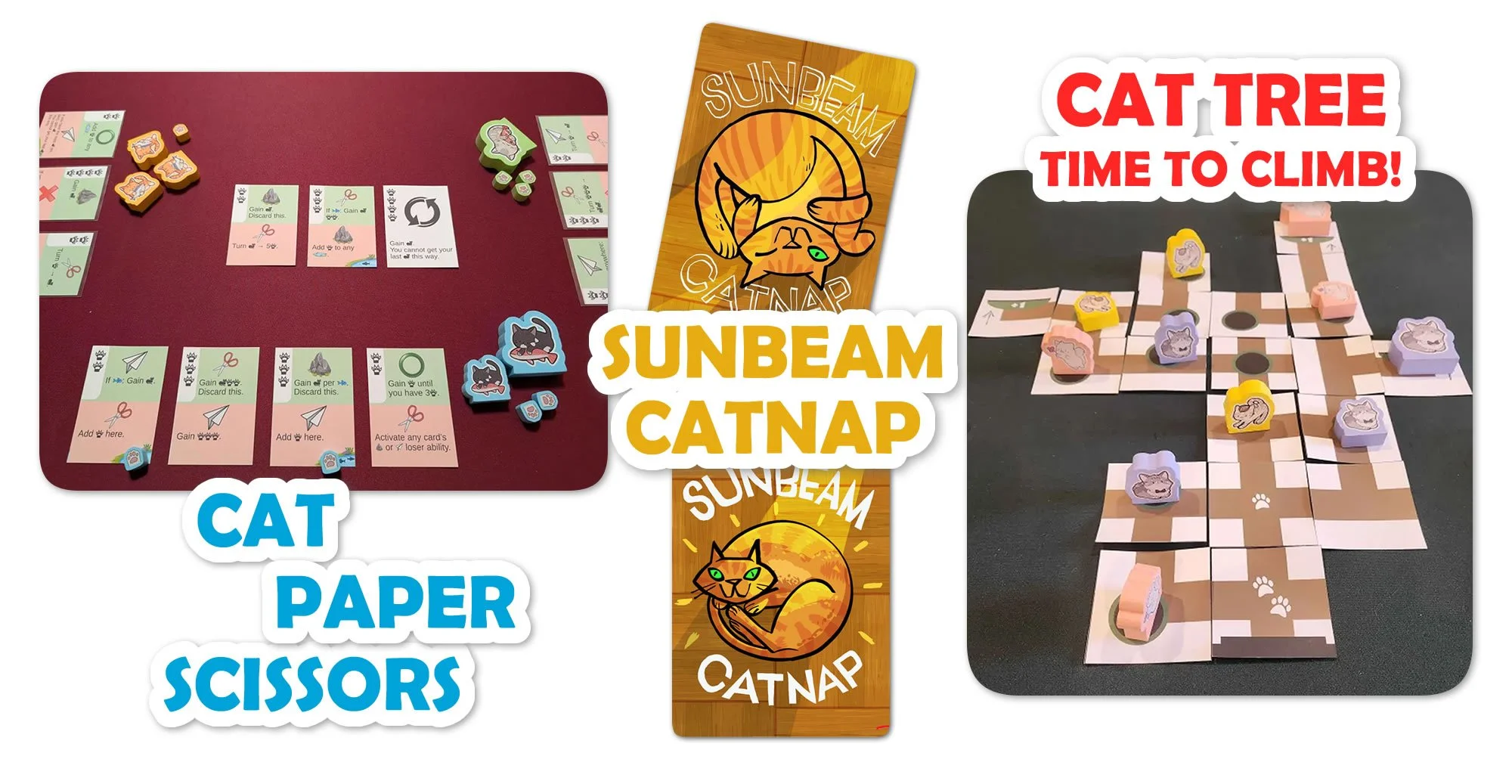Cat Tree: Time to Climb! is a light tile-laying strategy game about cats climbing a cat tree. Players use cards to build a communal cat tree, then try to get their cats to the highest perches, moving other players' cats out of the way, and stealing their perches. At the end of the game, only cats in perches score, and the higher the level of the perch, the more points the cats are worth.