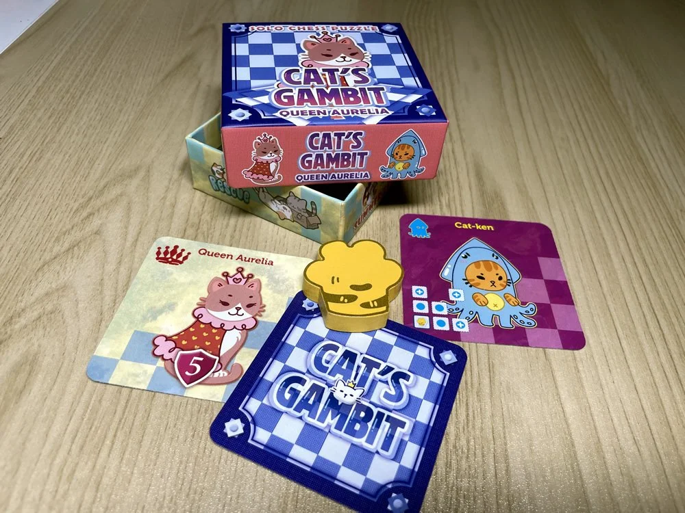 Cat's Gambit is a solo chess puzzle where players strategically place cards representing chess pieces on a 4x4 grid. The objective is to play all the cards without getting checkmated by the four Cat-kens (Cat Krakens). Each turn, a card is placed, continuing until an end-game condition is triggered. If the queen is placed in check twice, the game ends immediately. Otherwise, at the game's conclusion, points are tallied to determine the player's royal ranking within the majestic kingdom of cats.
