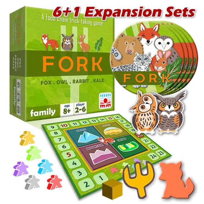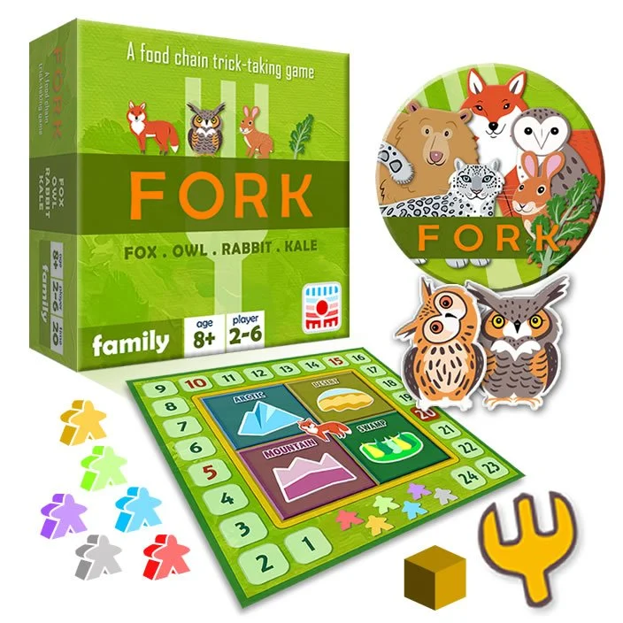 F.O.R.K. (Fox, Owl, Rabbit, Kale) is a food chain trick-taking game for 2 to 6 players. The game is fun to play and the rules are easy to learn. It's perfect even for children and people who never played trick-taking games.