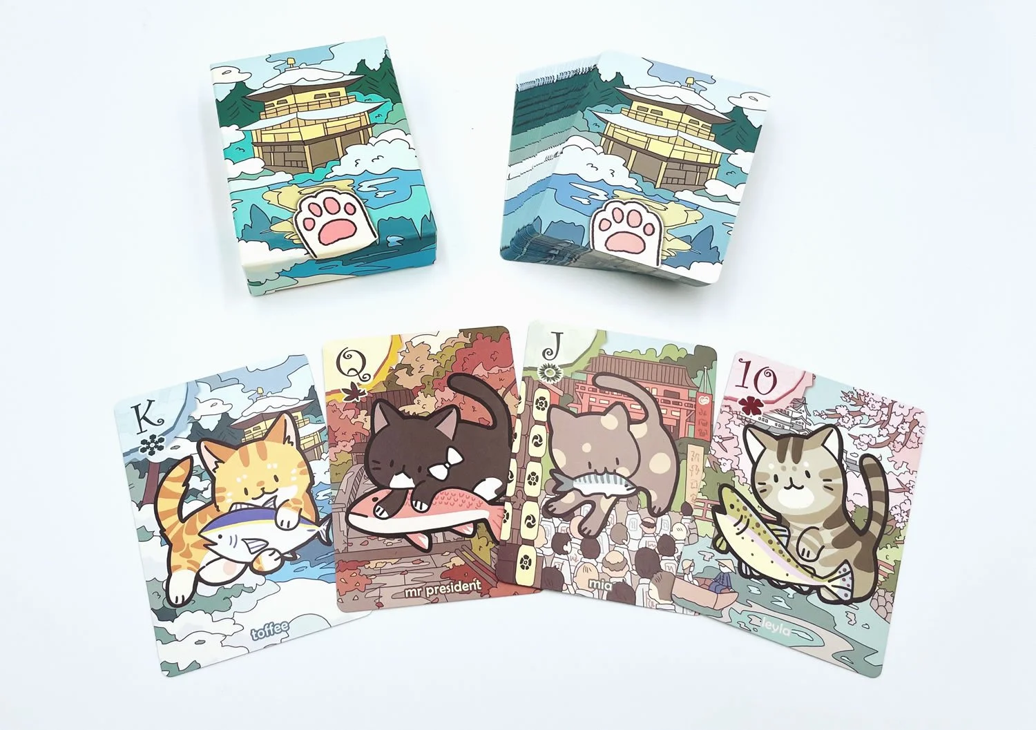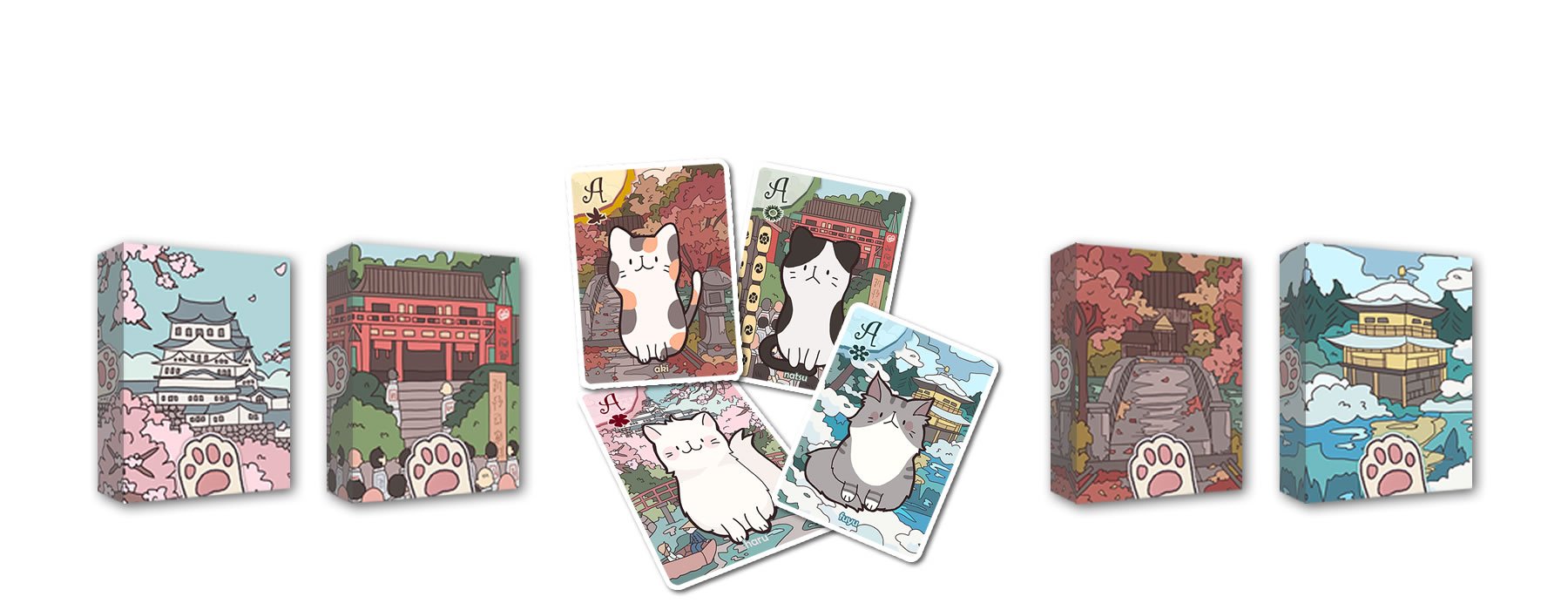 There are four different packs to choose from, one for each season in Kyoto. All four packs contain the same 54 cards and artwork—the only difference is the card backs, which feature a unique seasonal design to match Spring, Summer, Fall, or Winter.